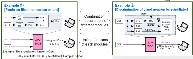 APV85G4有一些用于辐射测量模块的功能,像差分CFD、Delay、TAC、MCA等,这都是一些核辐射测量中必要的时间分析。